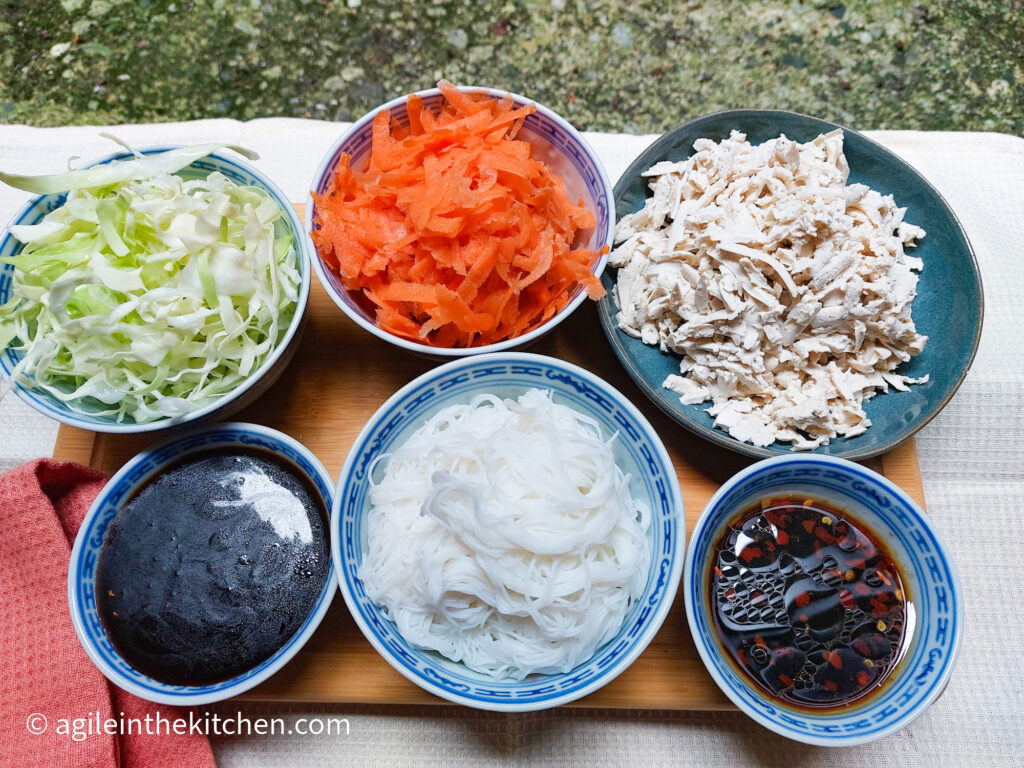 - Mix the carrots, white cabbage and rice noodles.